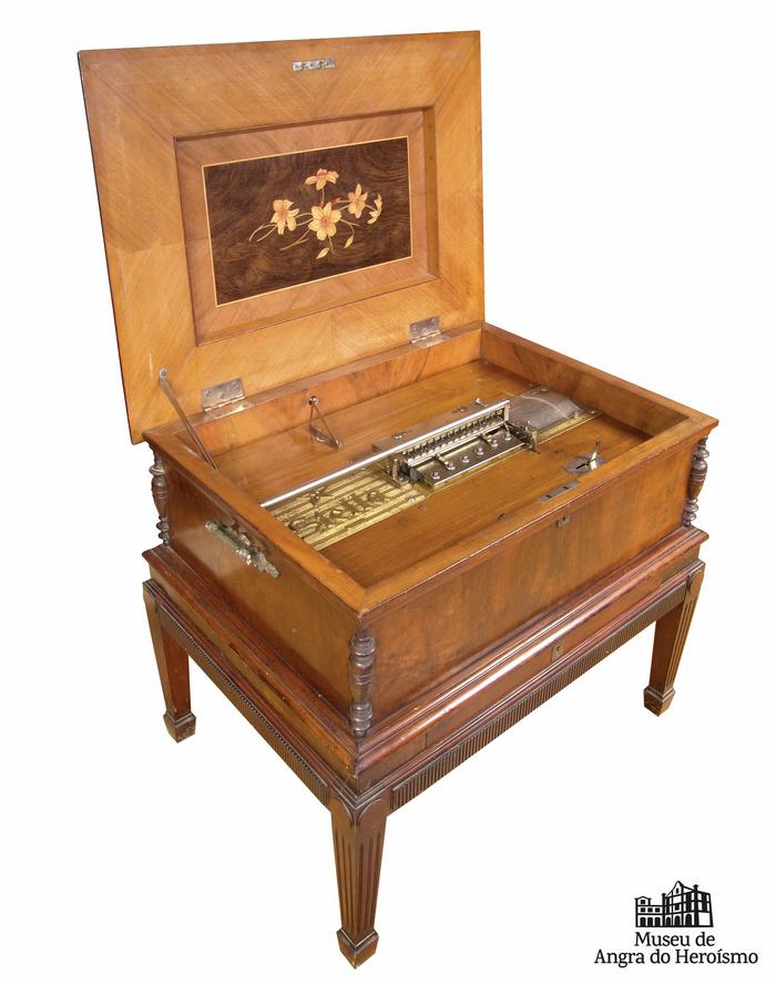 Caixa de música retangular com tampa e pés que fechado se assemelha um pequeno móvel. Datada do século XIX decorada com embutidos de madeira com decoração floral no interior da tampa. O mecanismo de funcionamento rege-se pelo mesmo do sistema de relojoaria, neste caso faz girar um disco metálico perfurado emitindo assim os diferentes sons, conforme o disco colocado. Este tipo de caixas popularizou-se sobretudo na Europa devido ao interesse e curiosidade que suscitava. 17.07.2025 [AGCM].